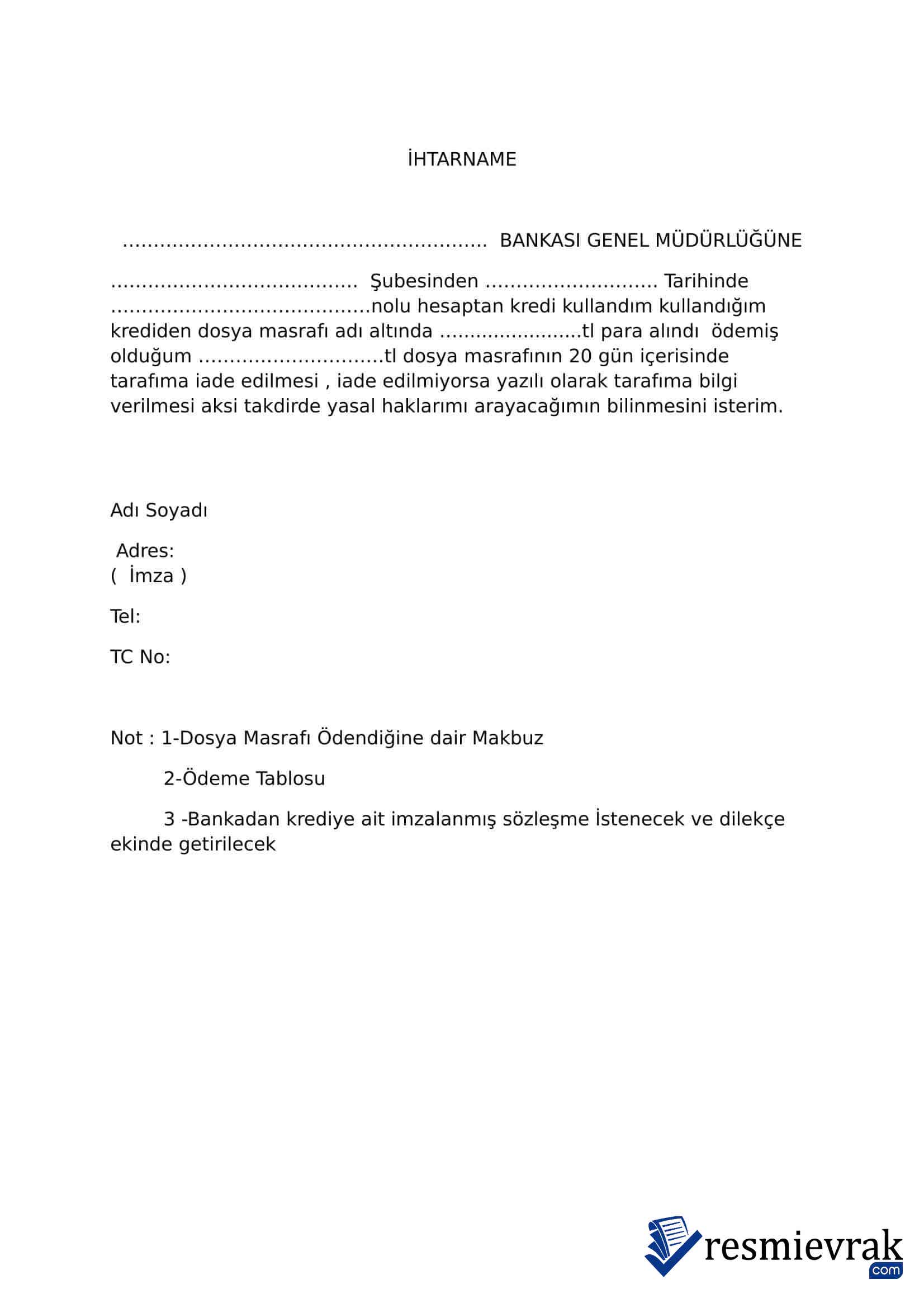 Dosya Masrafının İade Edilmesi İçin Verilecek İhtarname Örneğiİndir