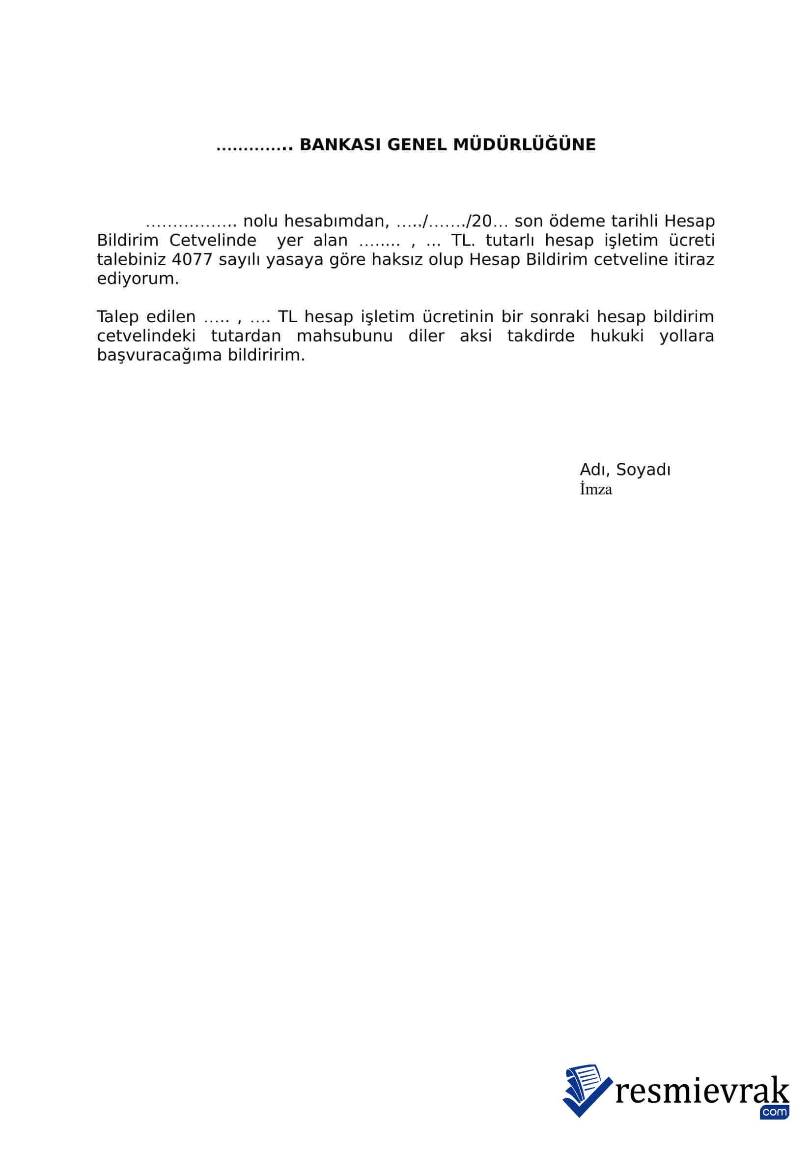 Kredi Kart Hesap İşletim Ücreti İptali İadesi İçin Verilecek Dilekçe Örneğiİndir